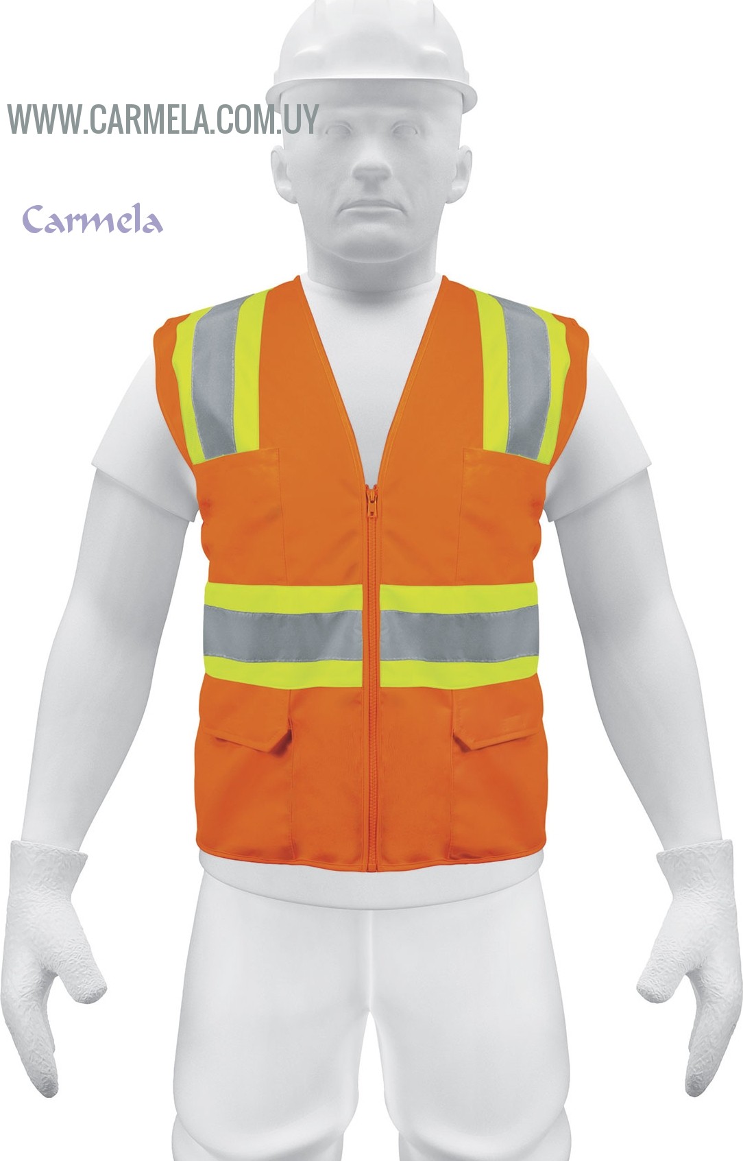 - Chalecos con cintas dobles de máxima visibilidad con cierre y 6 bolsas