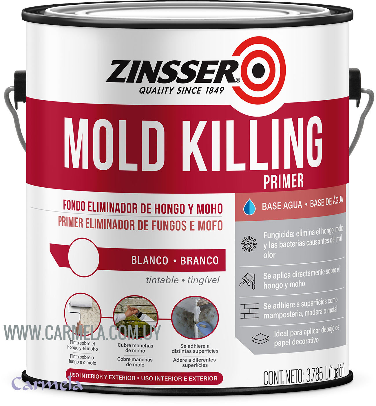 El imprimante Mold Killing Primer es la última innovación de Zinsser. Es un fondo / sellador / protector base agua con funguicida que puede aplicarse directamente sobre hongos, moho y musgo eliminándolos y previniendo su reaparición.